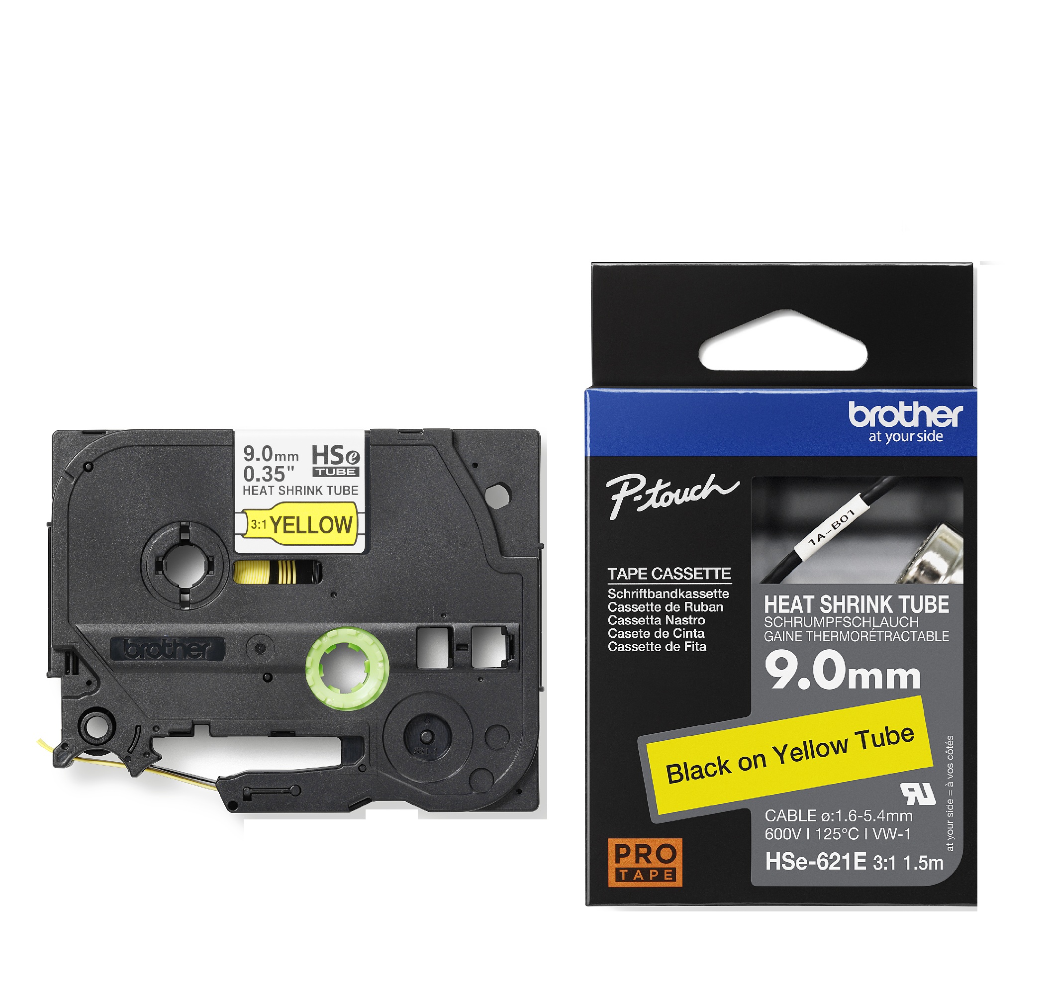 The Brother HSe-621E is a specialized, non-adhesive heat shrink tube tape cassette designed for marking and identifying cables, fibers, and wires. The tubing has a shrink ration of 2:1 and is recommended for general marking applications where a secure cable identification is required. It is primarily used with Brother P-touch industrial label printers (E-series). The thermal transfer ink is sandwiched between two protective layers of PET (polyester film), protecting the text against the effects of liquids, abrasion, temperature, chemicals and sunlight.
